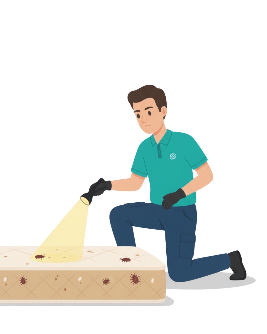 Cada intervención comienza con una inspección minuciosa para determinar el alcance de la infestación. Se revisan colchones, somieres, cabeceros, muebles, enchufes, rodapiés y cualquier punto susceptible de ocultamiento. Esta fase es fundamental para identificar las zonas críticas y establecer el tipo de tratamiento más adecuado.